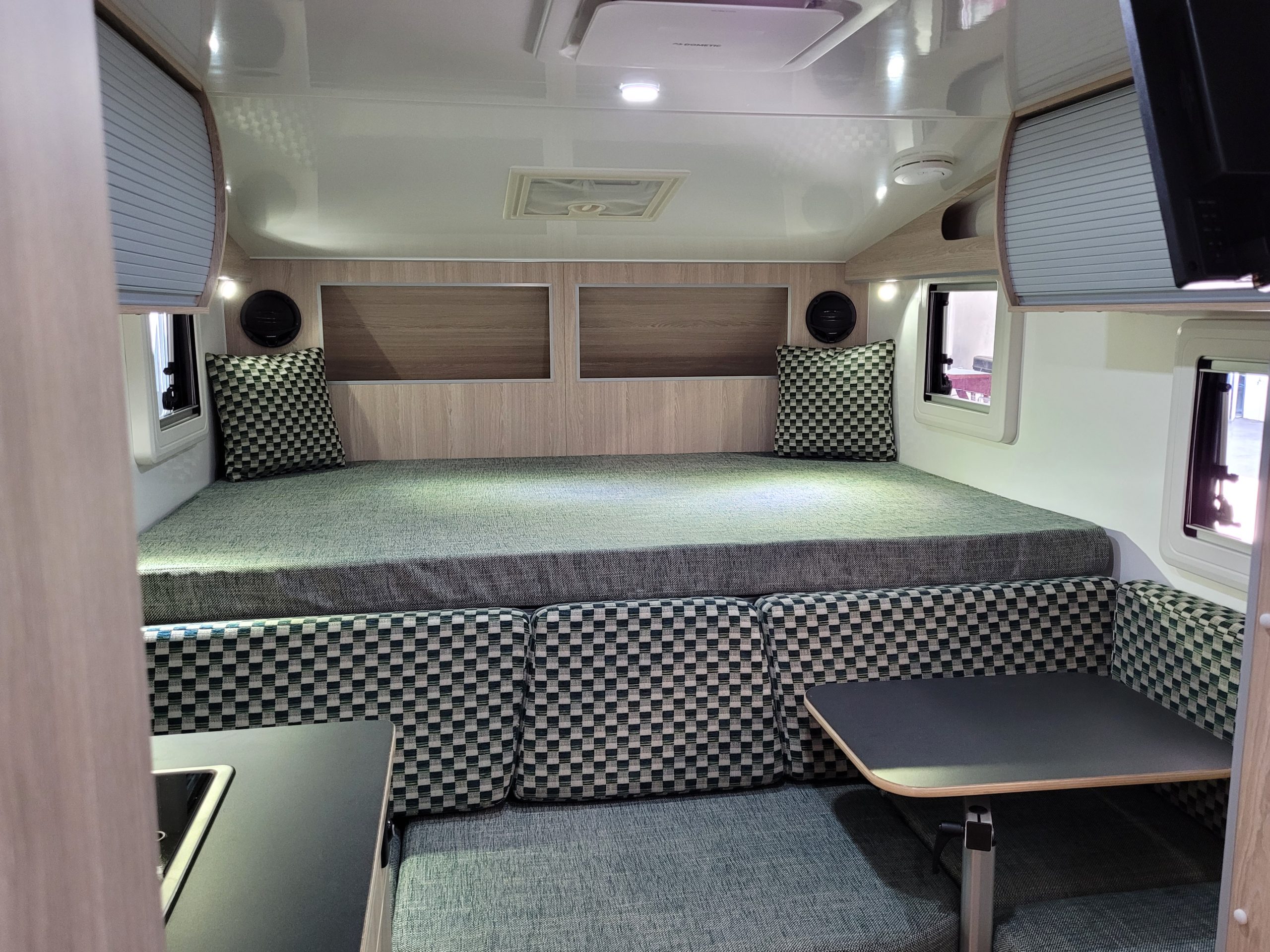 The “Woondabaa” is our model for space cab vehicles with a flat tray. With 2300mm its floor length is shorter compared to the Optima, but it still has the same spacious bathroom with shower, inbuilt cassette toilet and vanity. The Ozcape Woondabaa is a very livable Slide-On.